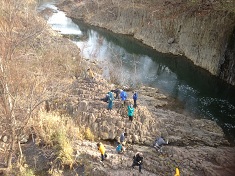 - 八剣山下、御料橋にて安山岩の遠望地質見学・露頭観察および岩石採集を行った。