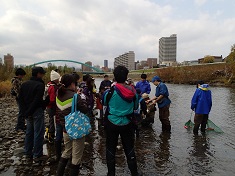 その後、水穂大橋に移動し、観察ポイントの見つけ方の説明を聞きながらサケの産卵行動を観察した。投網でサケを捕獲する様子を見学した。続いて下流のポイントで、刺し網による捕獲を行った。