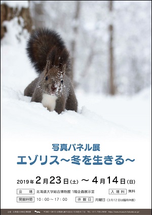 北海道の生き物のなかでも、エゾリスはもっとも身近な親しみのある小哺乳類ではないでしょうか。この度、自然写真家・南 尚貴さんのご協力を得て「写真パネル展 エゾリス~冬を生きる~」を開催します。旭川周辺で撮影された冬のエゾリスの、可愛らしくも逞しい貴重な姿をご覧ください。