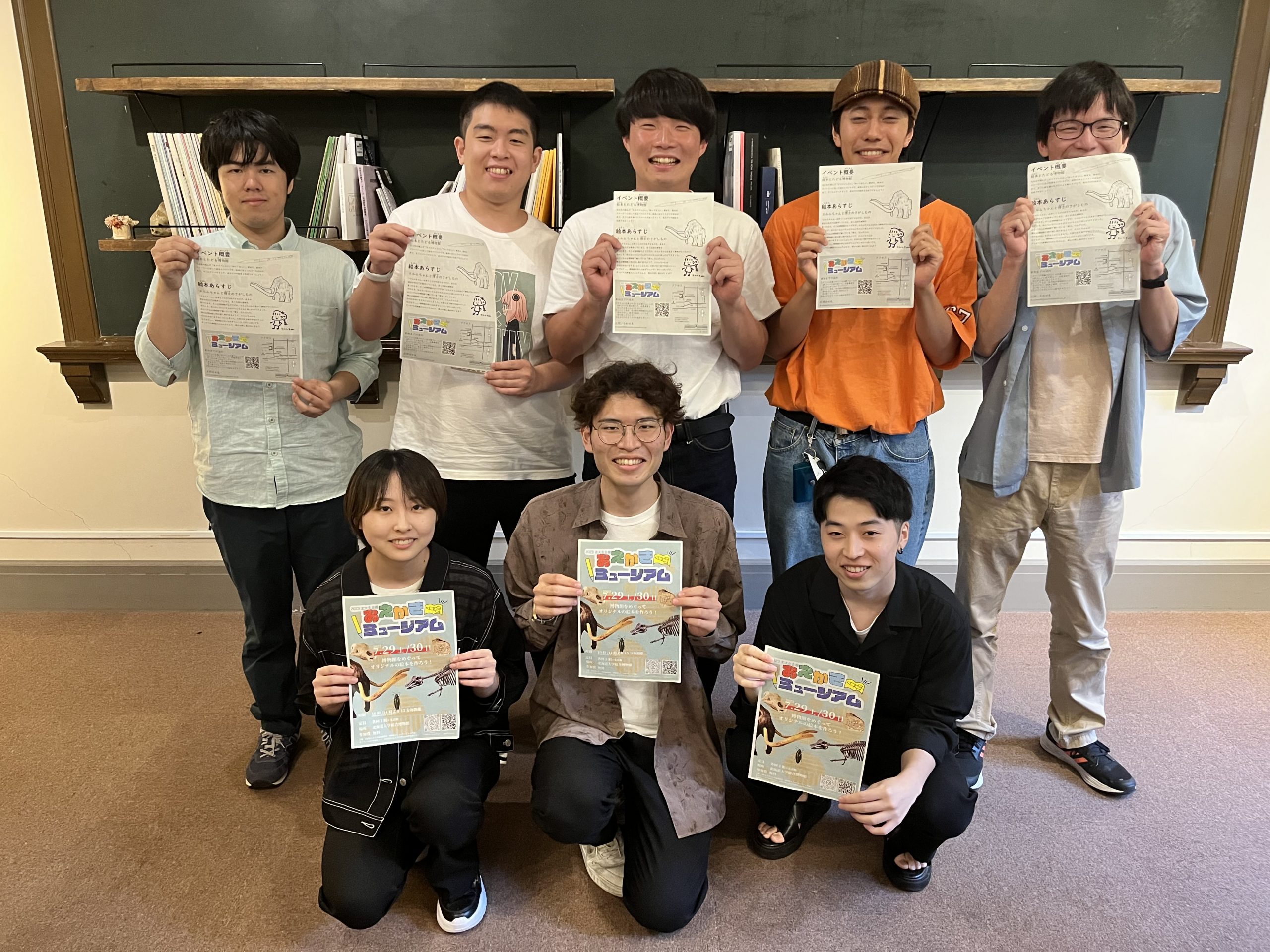 広報班ではチラシの完成から配布までを完了させた。チラシは一部の文章、レイアウトを修正したものを印刷し、総合博物館内で配布用に設置したほか、広報班の学生が九条小学校を訪問し、生徒たちに配る分のチラシと博物館のパンフレットを届けた。また、チラシの両面を A3 サイズに並べたポスターを北海道大学構内の掲示板に掲載する依頼も完了した。