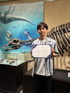 このたび理学院優秀研究奨励賞を賜り、大変光栄に存じます。本受賞は、日頃よりご指導・ご支援くださった指導教員の小林先生をはじめ、研究室の皆さま、化石レプリカをご提供くださいました有限会社ゴビサポートジャパンの高橋様、そしてモンゴルの研究機関の皆さまの多大なるご協力の賜物です。この場をお借りして、心より御礼申し上げます。
