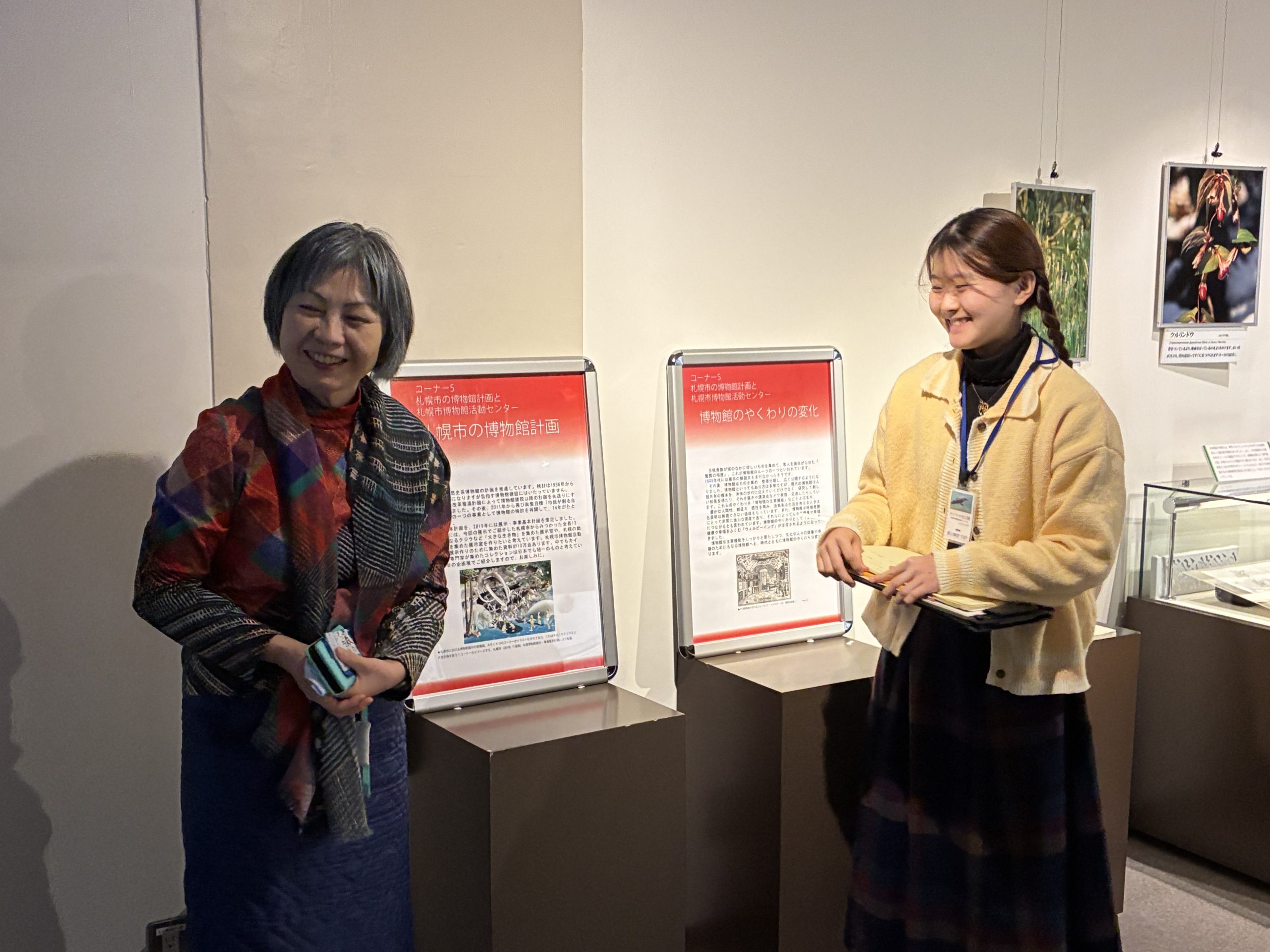 事前に、展示を企画した札幌市博物館活動センターの担当学芸員からは展示内容について、総合博物館の博物館教育担当教員からは解説の意義と方法について説明を受けました。会期中、解説に慣れていらっしゃる博物館の展示解説ボランティアの方々からアドバイスしていただいたり、他学生解説スタッフの対応を参考にして、6回の解説に臨みました。展示室での対応や質疑応答の内容は担当学芸員と教員でチェックし、解説スタッフ全員で共有しました。毎回、解説終了後にはミニレポートを提出して担当教員からのフィードバックを受けました。また、互いの対応や課題、思いを話し合う中間報告会にも参加し、展示解説についての個々の意識や臨機応変な取り組み方を共有することができました。