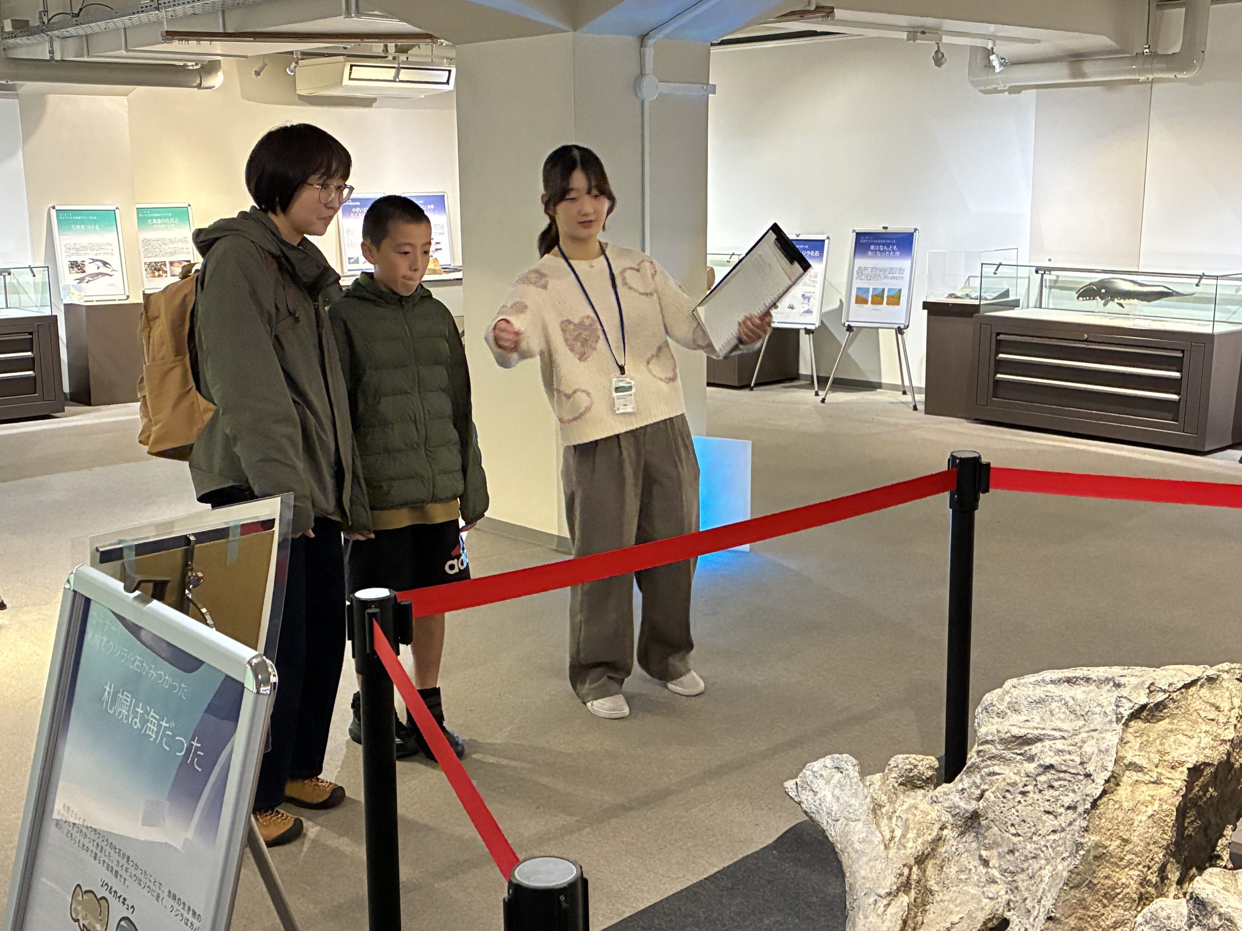 今回の企画展には目玉であるサッポロクジラの頭部化石レプリカ以外にも、北海道各地で見つかった各時代のクジラ化石や札幌の希少植物標本等が展示されており、最後に札幌市の博物館計画に関するパネル展示という流れになっていた。展示の順番も緻密に工夫されたものだったが、展示品ひとつひとつに集中していると全体の大きな流れを見逃してしまいがちであると、展示解説をする中で気づいた。そこで、単体の展示物の解説ではなく、前後の展示と関連付けた解説や続く展示への誘導を心掛けた。